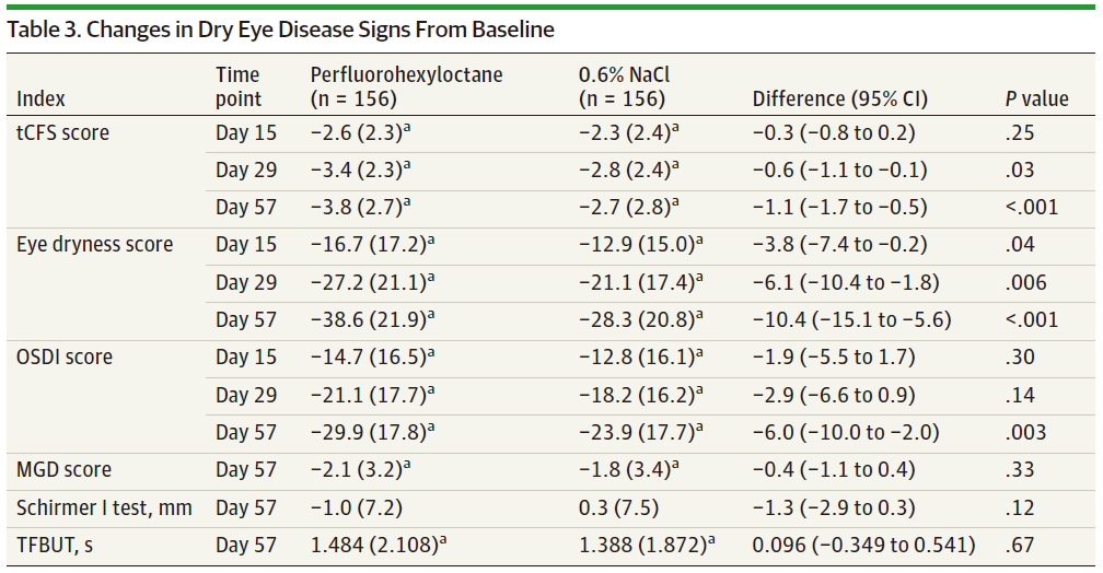 该研究的主要结果发现,在有效性方面,第57天SHR8058滴眼液组的tCFS评分(p < 0.001)和眼干评分(p < 0.001)较基线的变化优于对照组。tCFS评分和眼干评分分别在第29天和第15天开始改善,并持续到第57天。与对照组相比,SHR8058滴眼液组有效缓解干眼症状,包括疼痛(p = 0.003)、干眼症症状意识(p < 0.001),干燥频率(p < 0.001)等。在安全性方面,SHR8058滴眼液组患者治疗期出现的不良事件(TEAE)和眼部TEAE少于对照组。此外,SHR8058滴眼液组和对照组患者分别有95.5%(149/156)和98.7%(154/156)报告依从性良好。SHR8058滴眼液组平均满意度评分(p < 0.001)和继续使用意愿评分(p < 0.001)高于对照组。